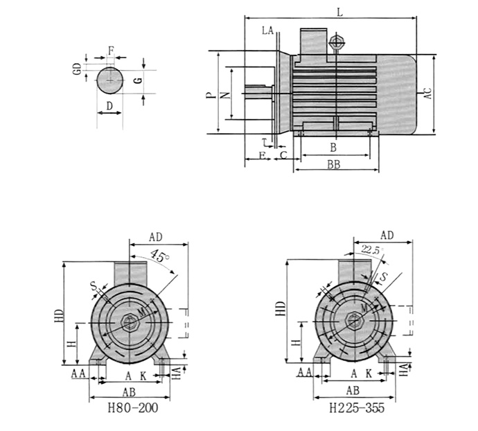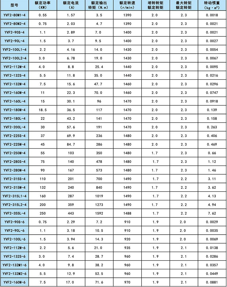YVF2 series have advantages as high efficiency, wide speed range, high precision, stable running, convenient operation and maintenance. The outline and Installation dimensions confirm to IEC standard. Enclosure protection degree IP55, equipped with enforced cooling fan, work duty S1, insulation Class F , rated voltage 380V, rated frequency 50HZ. It runs with constant torque at frequency 3HZ-50HZ, and 2 poles electric motors run with constant power at frequency 50-60HZ, 4 poles and 6 poles  electric motors run with constant power at frequency 50-100HZ.